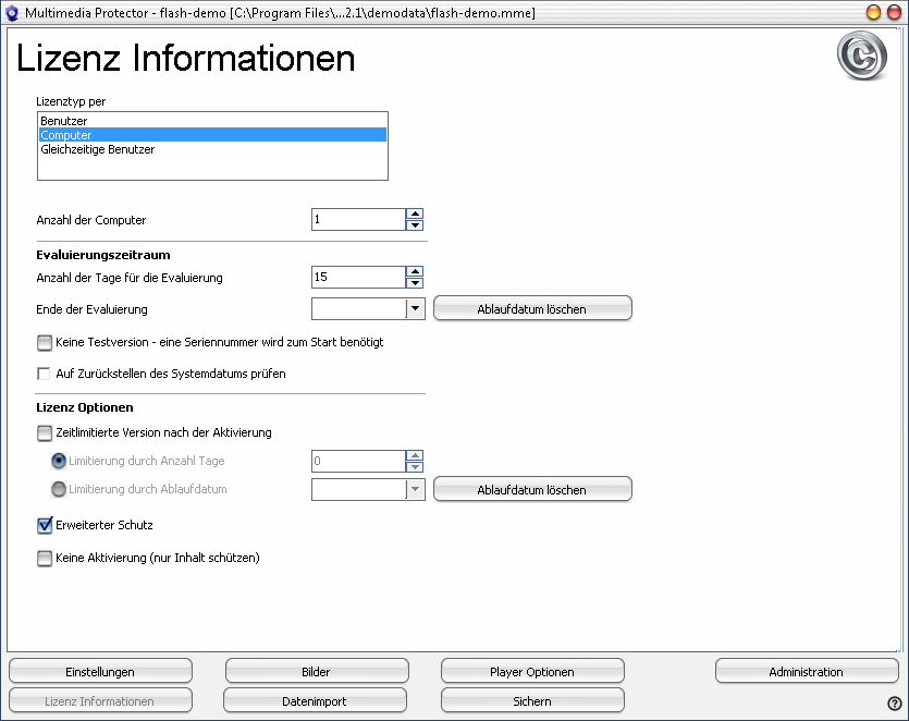 Wird Ihre Anwendung nur auf einem Einzelplatz betrieben, so wählen Sie den Lizenztyp "Computer" aus und setzen die "Anzahl der Computer" auf "1". In der Standard Version wird nur dieser Lizenztyp unterstützt. Für weitere Informationen zu diesem Lizenztyp klicken Sie hier.
