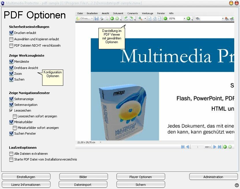 Multimedia Protector beinhaltet einen integrierten PDF Betrachter, welcher PDF Dateien bis zur Version 1.7 (Acrobat 8) unterstützt. Es werden jedoch nicht alle Funktionen, wie zum Beispiel multimediale Inhalte oder Formulare unterstützt. Weitere Informationen erhalten Sie hier.