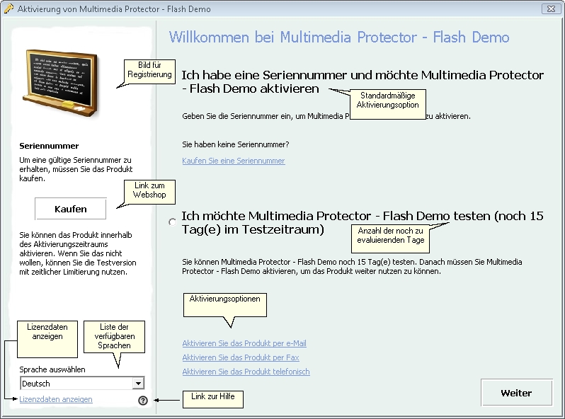 Dies ist der erste Dialog, welcher dem Benutzer angezeigt wird, solange die Anwendung noch nicht aktiviert wurde. Der Dialog kann je nach den von Ihnen gewählten Einstellungen abweichen.