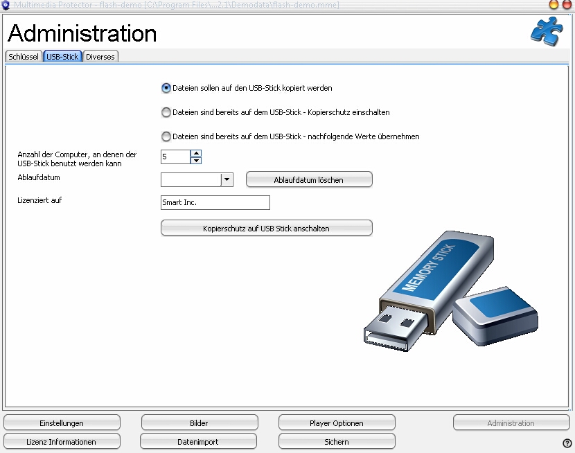 Multimedia Protector verfügt über die Möglichkeit, Ihr Produkt auf einem handelsüblichen USB-Stick zu schützen. Für weitere Informationen siehe: USB-Stick als Dongle-Ersatz