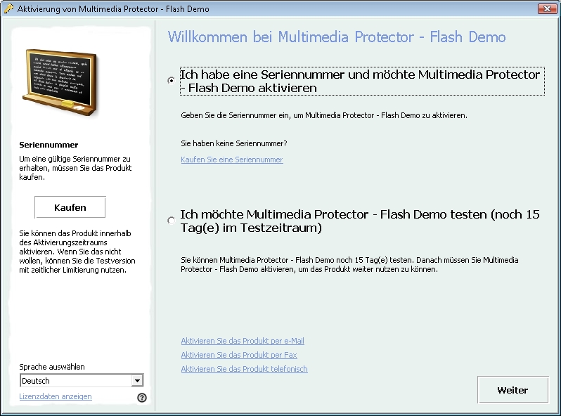 Die Anwendung kann im Evaluierungsmodus getestet werden. Details können Sie dem Kapitel Evaluierungsoptionen entnehmen.