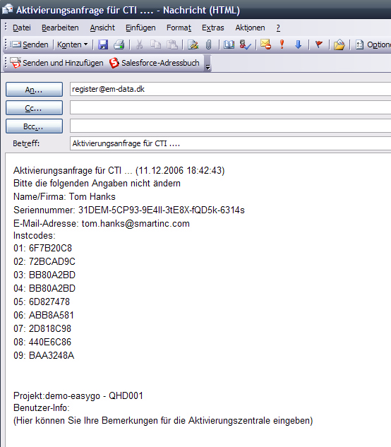 Ihr Standard E-Mail Programm wird geöffnet und ein E-Mail mit Ihren Hardwaredaten und Lizenzinformationen erstellt. Drücken Sie Absenden, um das E-Mail zu unserem Aktivierungszentrum zu senden. Sie erhalten einen Freischaltschlüssel innerhalb von 2-3 Arbeitstagen.
