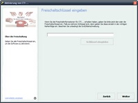 Nachdem Sie den Freischaltschlüssel per E-Mail angefordert haben, erscheint der unten abgebildete Bildschirm bei jedem Programmstart. Geben Sie den Freischaltschlüssel ein, den Sie per E-Mail erhalten haben. Drücken Sie die Schaltfläche Weiter. Ist die Aktivierung erfolgreich, erscheint der Bildschirm Aktivierung abgeschlossen.