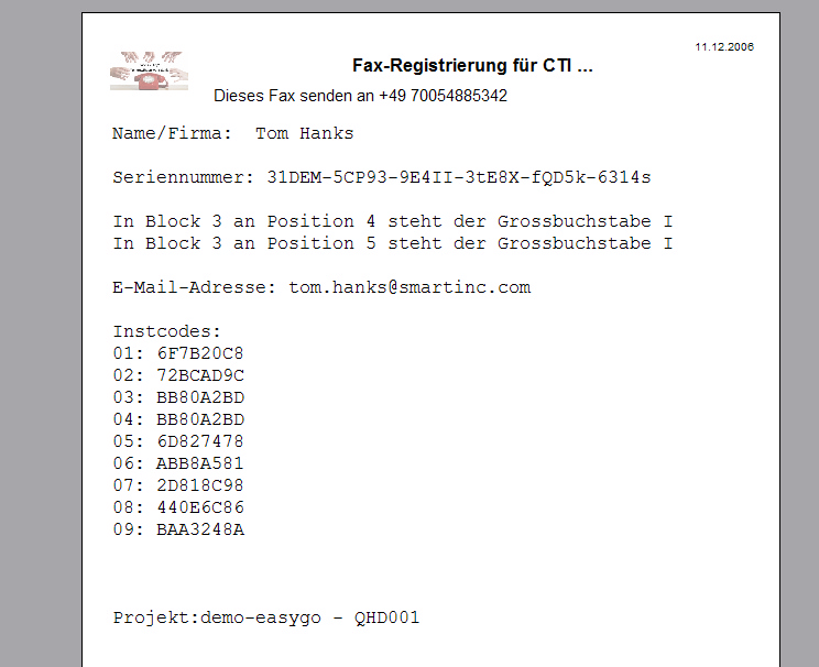 Die Fax Aktivierung benötigt die Seriennummer, Name/Firmenname und Ihre E-Mail Adresse.