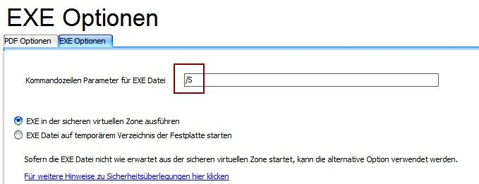 •Im Dialog der EXE Optionen , wird ein Kommandozeilenparameter festgelegt, z.B. /S