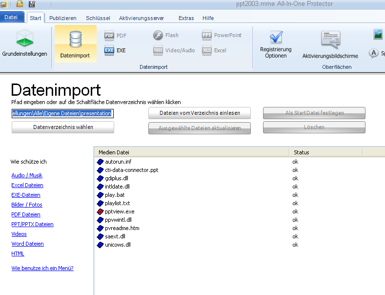 Importieren Sie nun alle Dateien Ihres Projektverzeichnisses und definieren die Datei "pptview.exe" als Startdatei. Diese ist nun durch ein rotes Symbol gekennzeichnet.